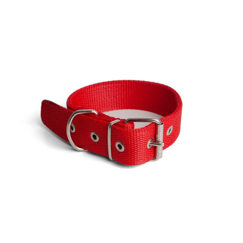Collar rojo para Perros en cinta de nylon de 2-3 cm de ancho, reforzada con cuero de gran calidad y resistencia, disponible en varias medidas.
