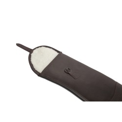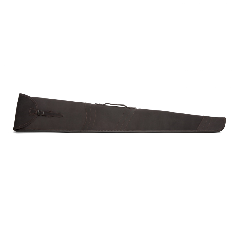 Funda para escopeta superpuesta, en cuero engrasado oscuro de gran calidad con forro interior. Longitud interior 124 cm.