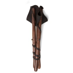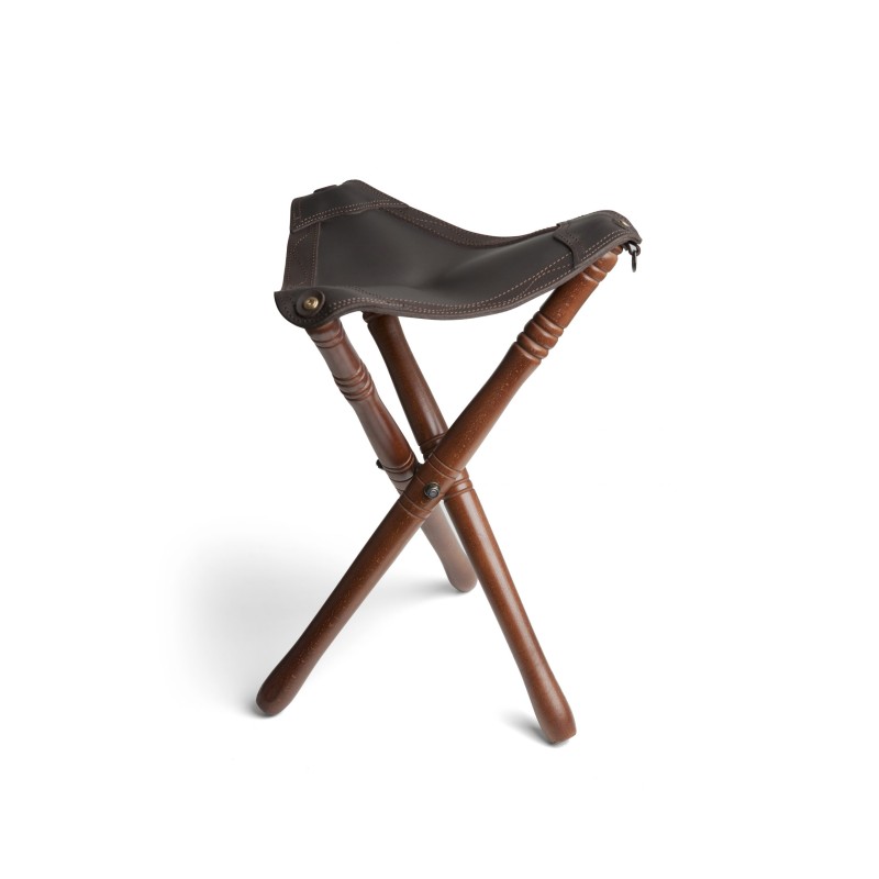 Banquillo en cuero engrasado de alta calidad, con patas de madera de haya muy resistentes y correa para facilitar su transporte.