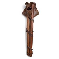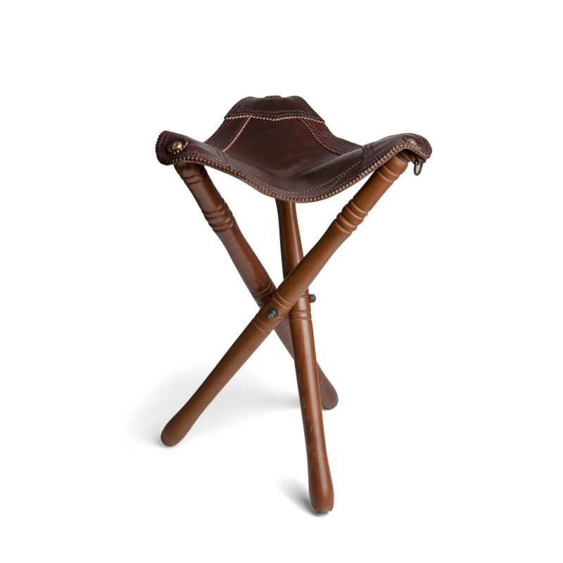Banquillo en piel vaquetilla burdeos de alta calidad, con patas de madera de haya resistentes y correa para facilitar su transporte.