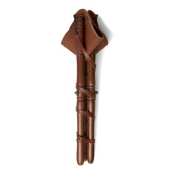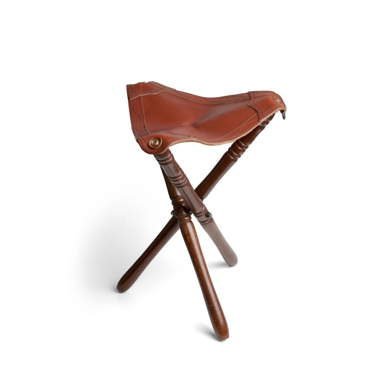 Banquillo en piel vaquetilla color coñac de alta calidad, con patas de madera de haya muy resistentes y correa para facilitar su transporte.