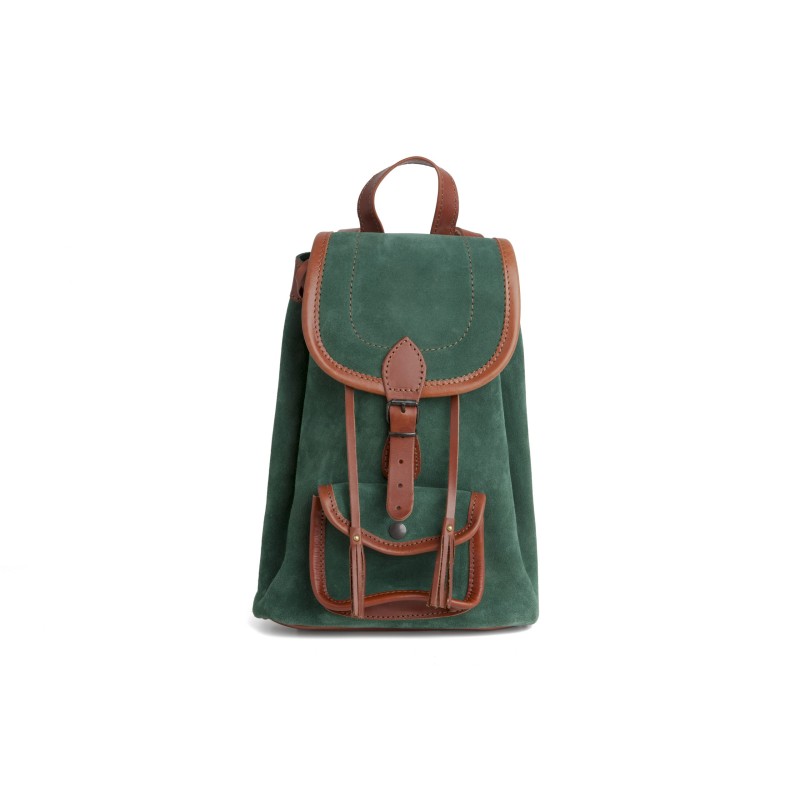 Bolso para señora en cuero afelpado verde, con remates en piel vaquetilla color coñac de alta calidad, ideal para ojeo y montería.
