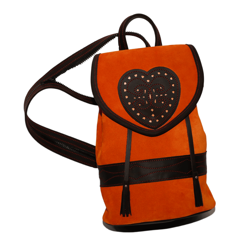 Bolso para señora en cuero afelpado color mandarina, con remates en cuero engrasado oscuro de alta calidad, ideal para ojeo y montería.